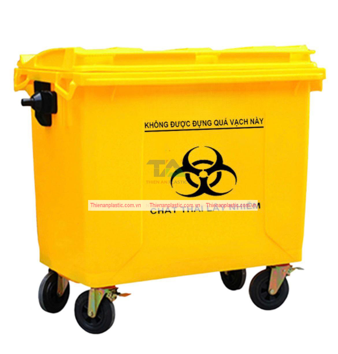 Thùng Rác Y Tế 660L 660 lít (1350x830x1110mm) Nhựa HDPE nguyên sinh, bánh xe, nắp kín. Chuyên cho chất thải y tế nguy hại. Sản phẩm chính